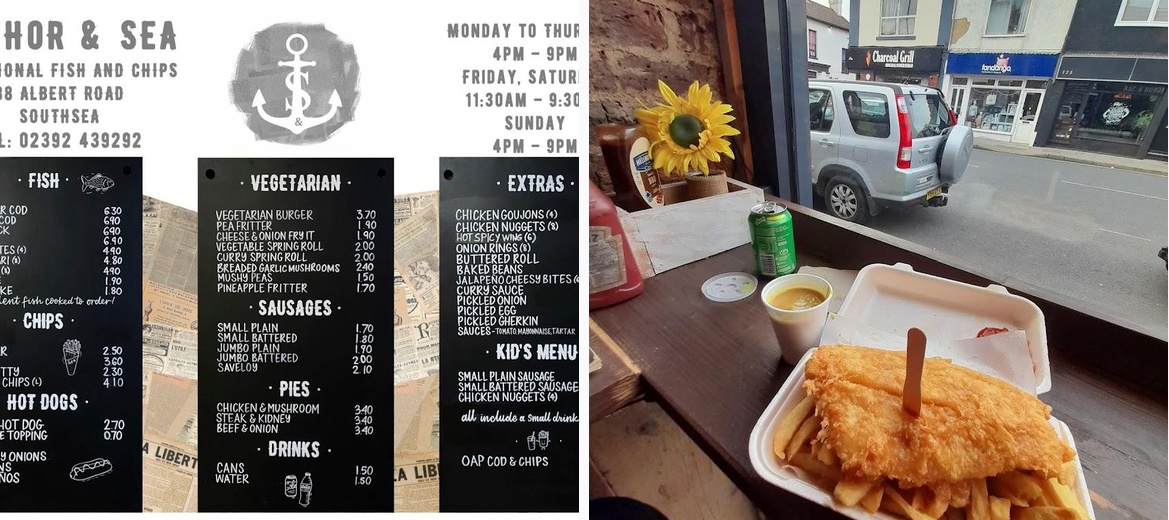 Discover the best traditional fish and chips at Anchor & Sea in Southsea! Enjoy our crispy cod and freshly made chips, perfect for lunch or dinner. Offering no-contact delivery and takeaway options, we pride ourselves on quality and service. Visit us at 88 Albert Rd or call +44 23 9243 9292 for a delicious meal that keeps you coming back!